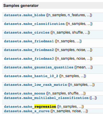 1 | sklearn.datasets.make_regression(n_samples=100, n_features=100, n_informative=10, n_targets=1, bias=0.0, effective_rank=None, tail_strength=0.5, noise=0.0, shuffle=True, coef=False, random_state=None)[source] |